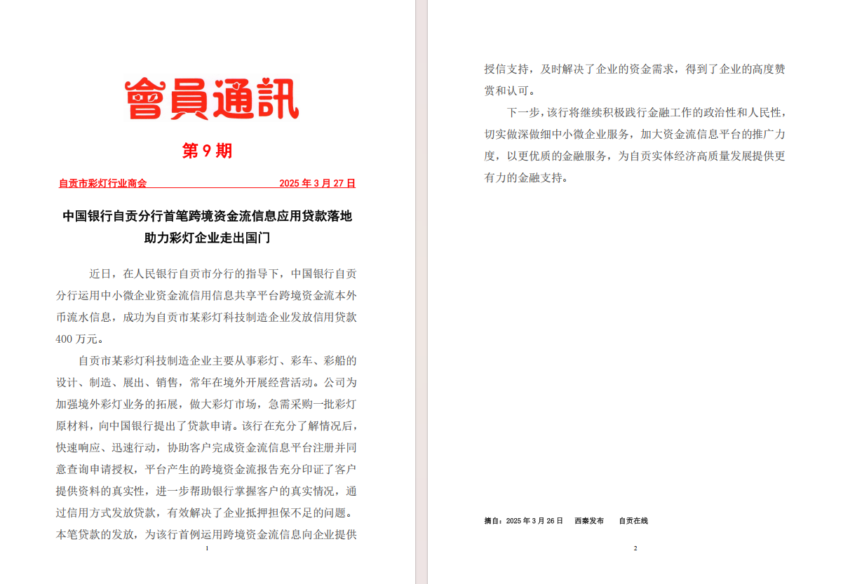中国银行自贡分行首笔跨境资金流信息应用贷款落地助力彩灯企业走出国门